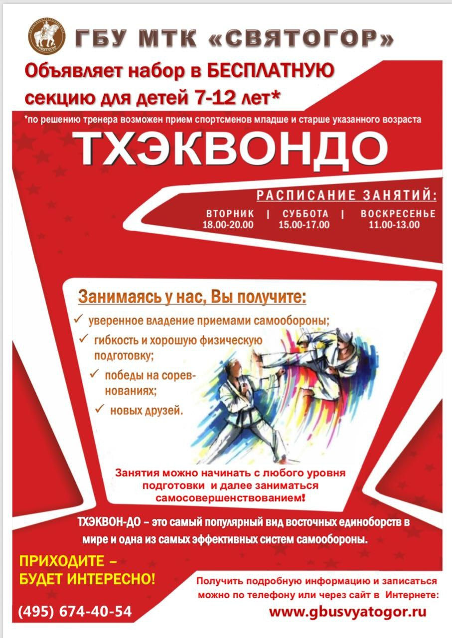 Секция "Тхэквондо" объявляет набор детей 7-12 лет! Бесплатно! Преимущества тхэквондо огромны: - оно вырабатывает физическую выносливость, уверенность в себе, самоуважение, позволяет контролировать вес, - готовит ребенка к школе (малыш, посещая занятия, привыкает к распорядку, дисциплине, самоконтролю, появляются стимулы к занятиям, появляется интерес к изучаемому); - оздоровляет; - улучшает рост; - развивает чувство коллективизма; - улучшает эмоциональное состояние; - повышает уровень интеллекта; - развивает такие качества, как ответственность и самостоятельность.